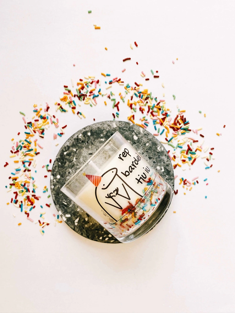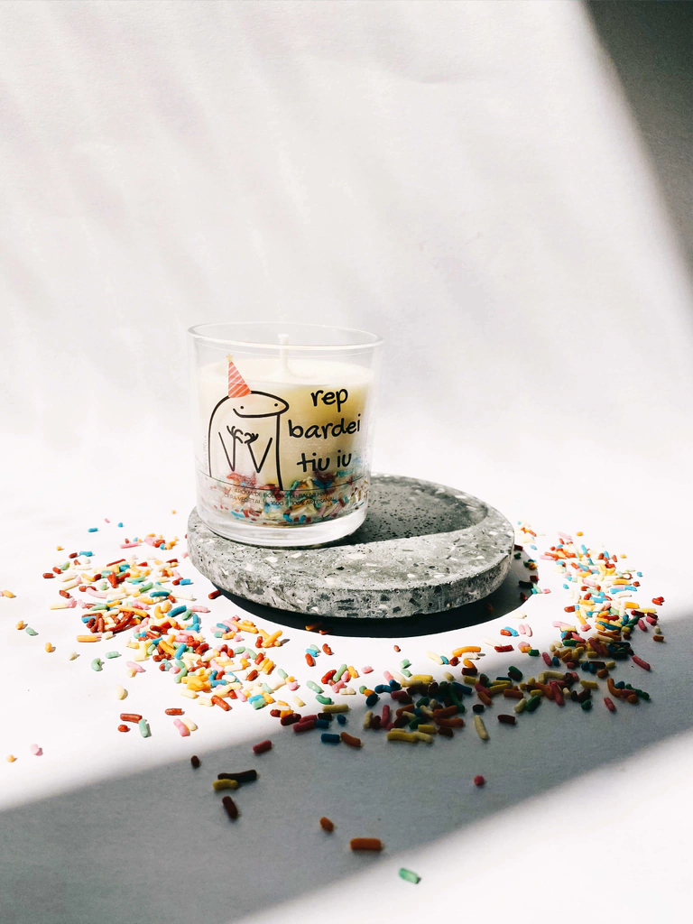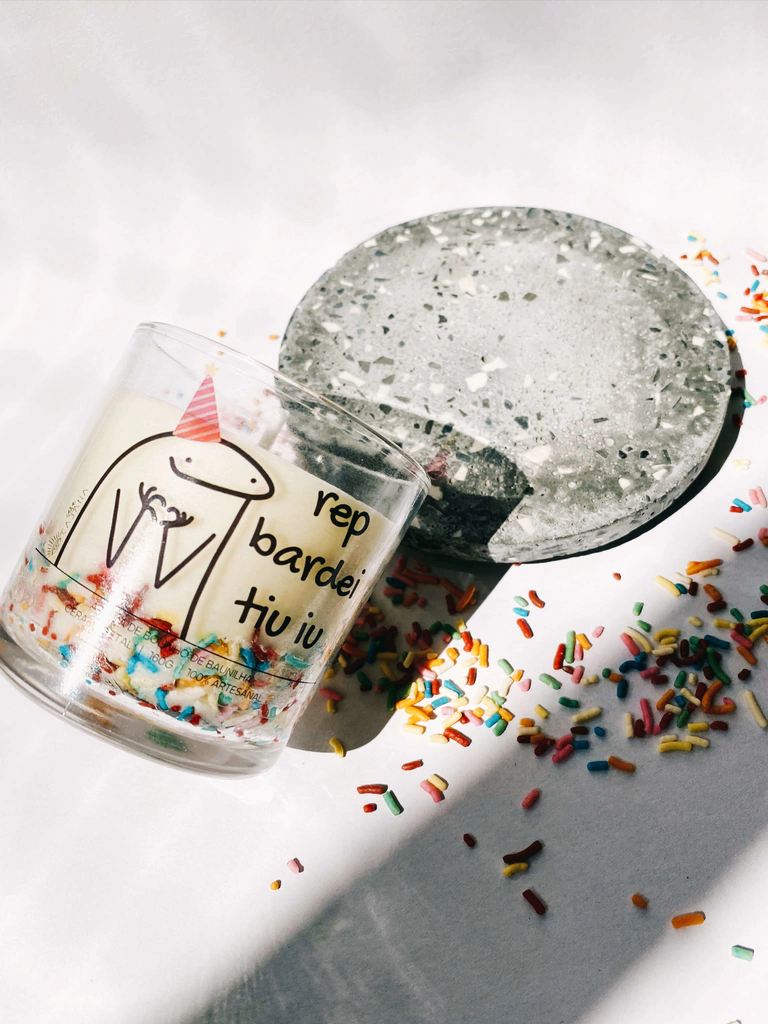 Inspirada nos memes Flork, nossa vela aromática de baunilha - rep bardei tiu iu traz um cheirinho delicioso de bolo de baunilha e tem detalhes de granulados coloridos no fundo do copo.
